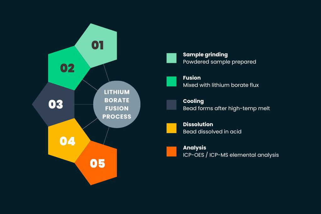 Lithium borate fusion is a high-temperature sample preparation technique used to dissolve geological materials into a homogeneous solution, suitable for analysis by either ICP-OES (inductively coupled plasma optical emission spectrometry) or ICP-MS (mass spectrometry). It is widely used when conventional acid digestion is not sufficient to break down the sample matrix, especially for geological rock and process samples with complex silicate structures.